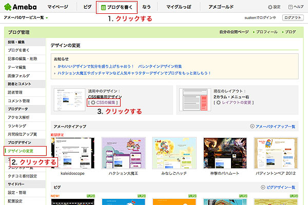 「ブログを書く」>サイドバーの「ブログデザイン」の「デザインの変更」>「CSSの編集」をクリックします。